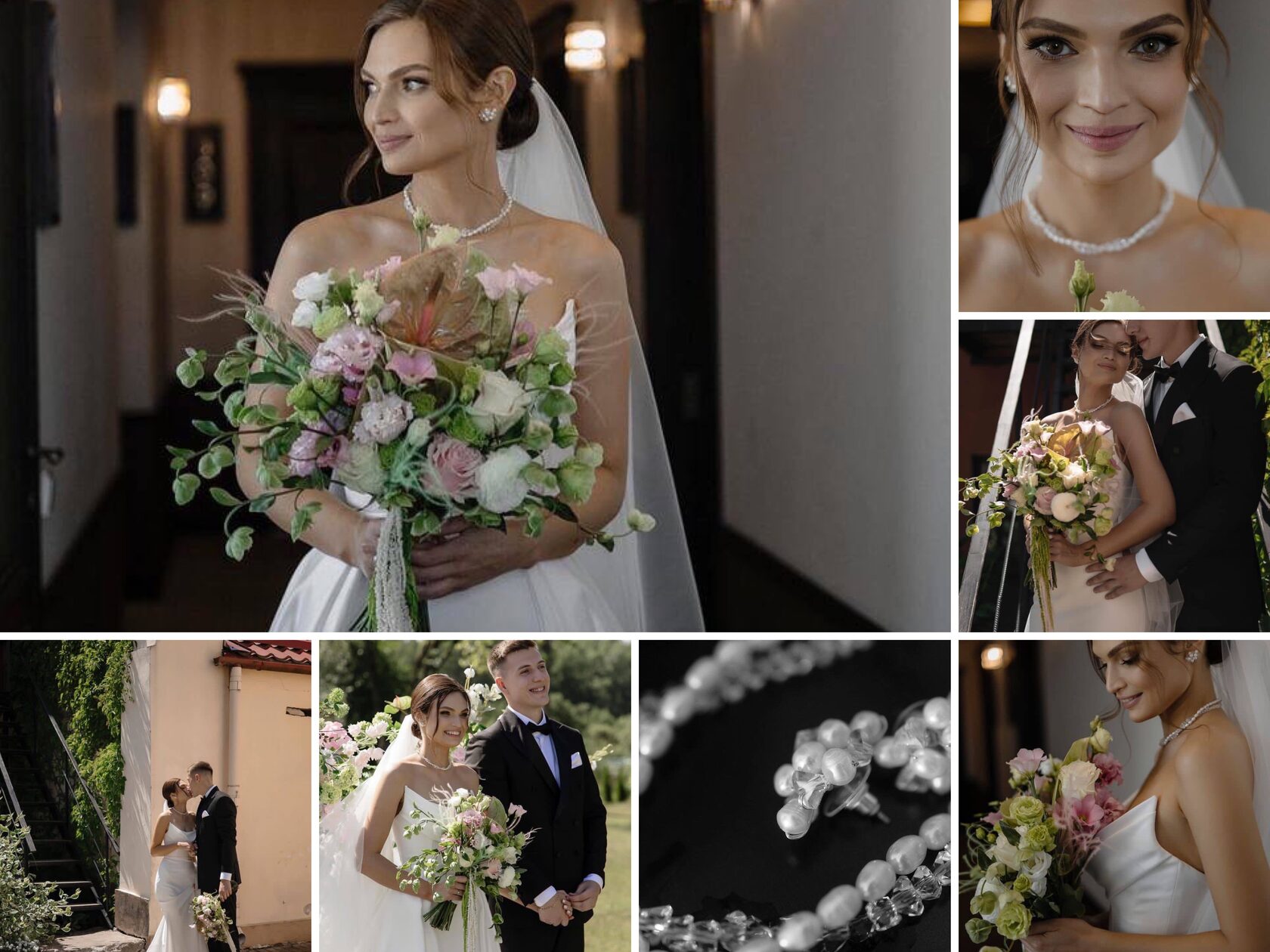 Украшения идеально сочетаются между собой и гармонично завершают свадебный наряд.